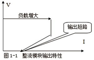 ● 短路保護(hù):本模塊采用回縮下垂限流方式,模塊輸出特性如圖1-1,輸出短路時(shí)模塊在瞬間把輸出電壓拉低到零,限制短路電流在額定輸出電流的15%以下,此時(shí)模塊輸出功率很?。◣资撸赃_(dá)到保護(hù)模塊和用電設(shè)備的目的。模塊可長(zhǎng)期工作在短路狀態(tài),不會(huì)損壞,排除故障后模塊可自動(dòng)恢復(fù)工作。